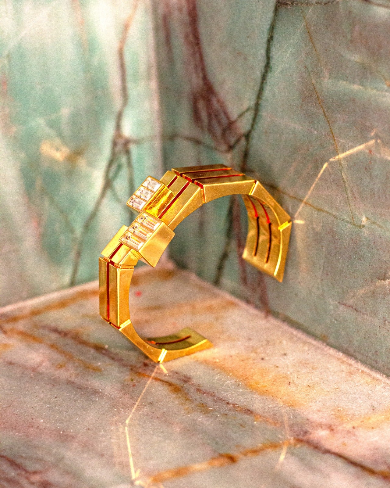 Elegante e seducente, la collezione Cascade è caratterizzata da inserti con tagli baguette dorati e cristalli, frutto delle mani esperte degli artigiani, che conferiscono ad ogni pezzo una particolare preziosità ed eleganza.